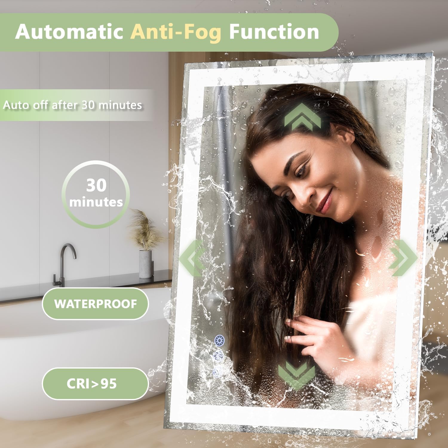 - 【Smart Anti-Fog Function】This wall bathroom smart mirror features a smart Anti-Fog function and a waterproof coating design. After turning on the Anti-Fog function for 3 minutes, the safe heating coil will disperse the fog from the center to the edge, and it will automatically shut down after 30 minutes, effectively saving energy
