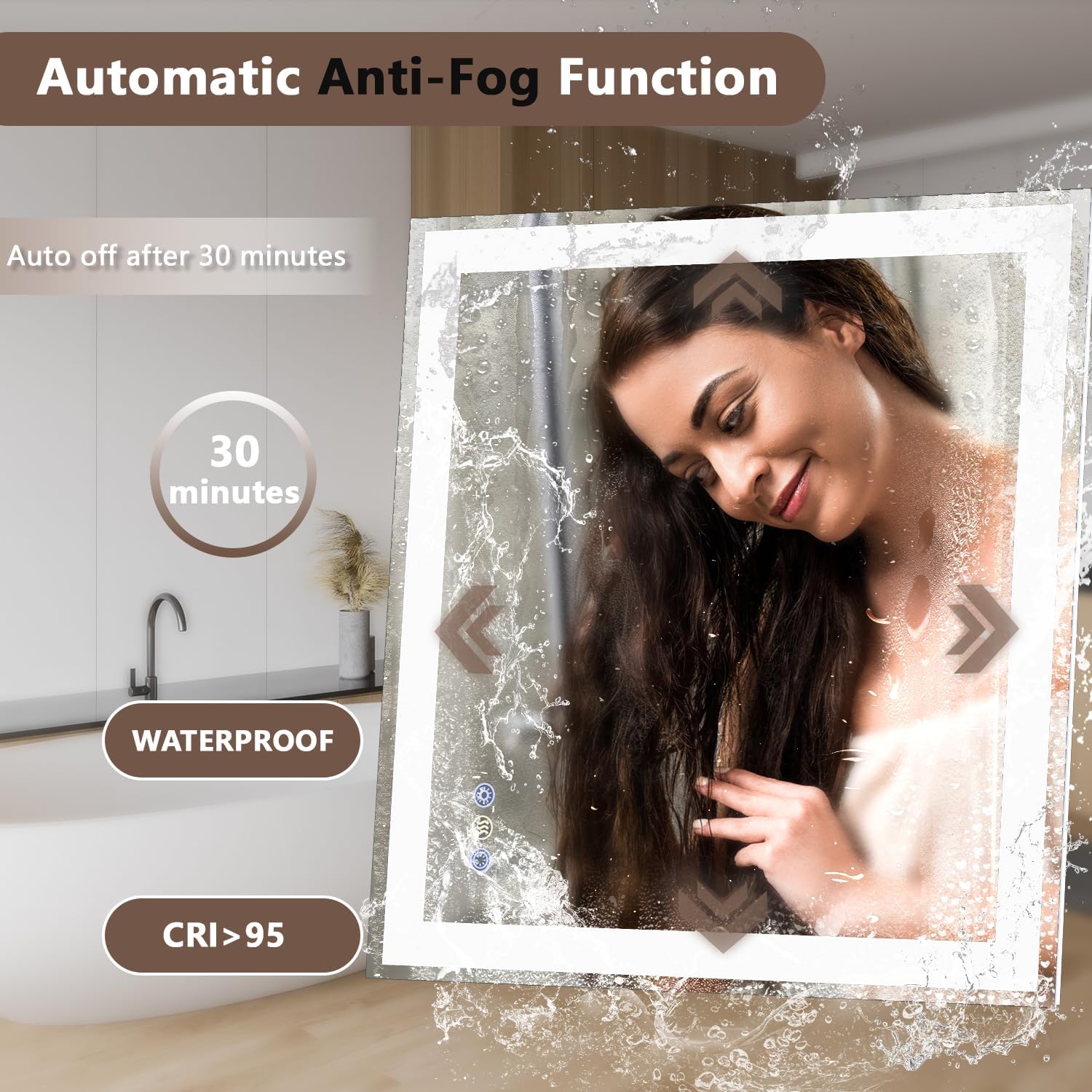 - 【Smart Anti-Fog Function】This wall bathroom smart mirror features a smart Anti-Fog function and a waterproof coating design. After turning on the Anti-Fog function for 3 minutes, the safe heating coil will disperse the fog from the center to the edge, and it will automatically shut down after 30 minutes, effectively saving energy