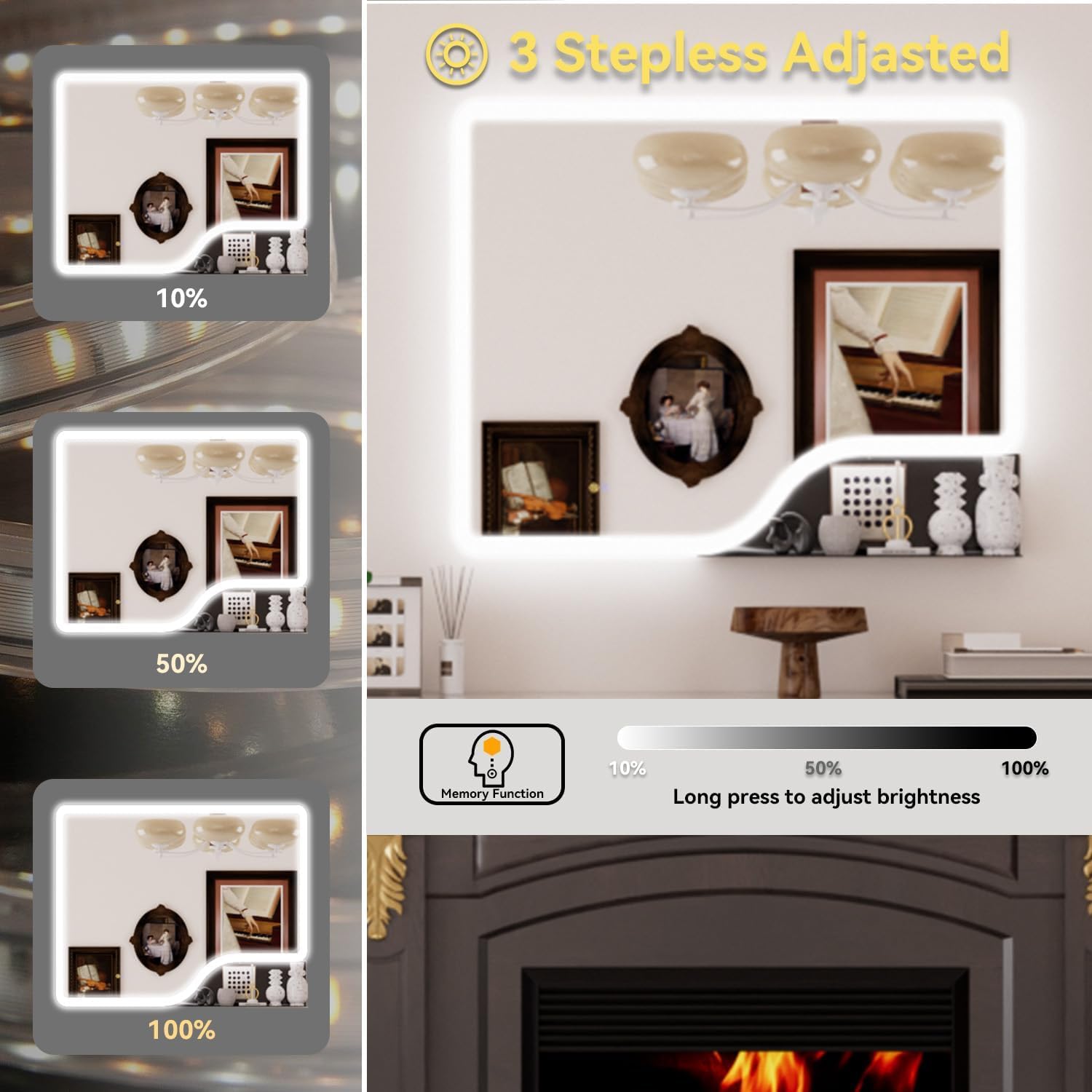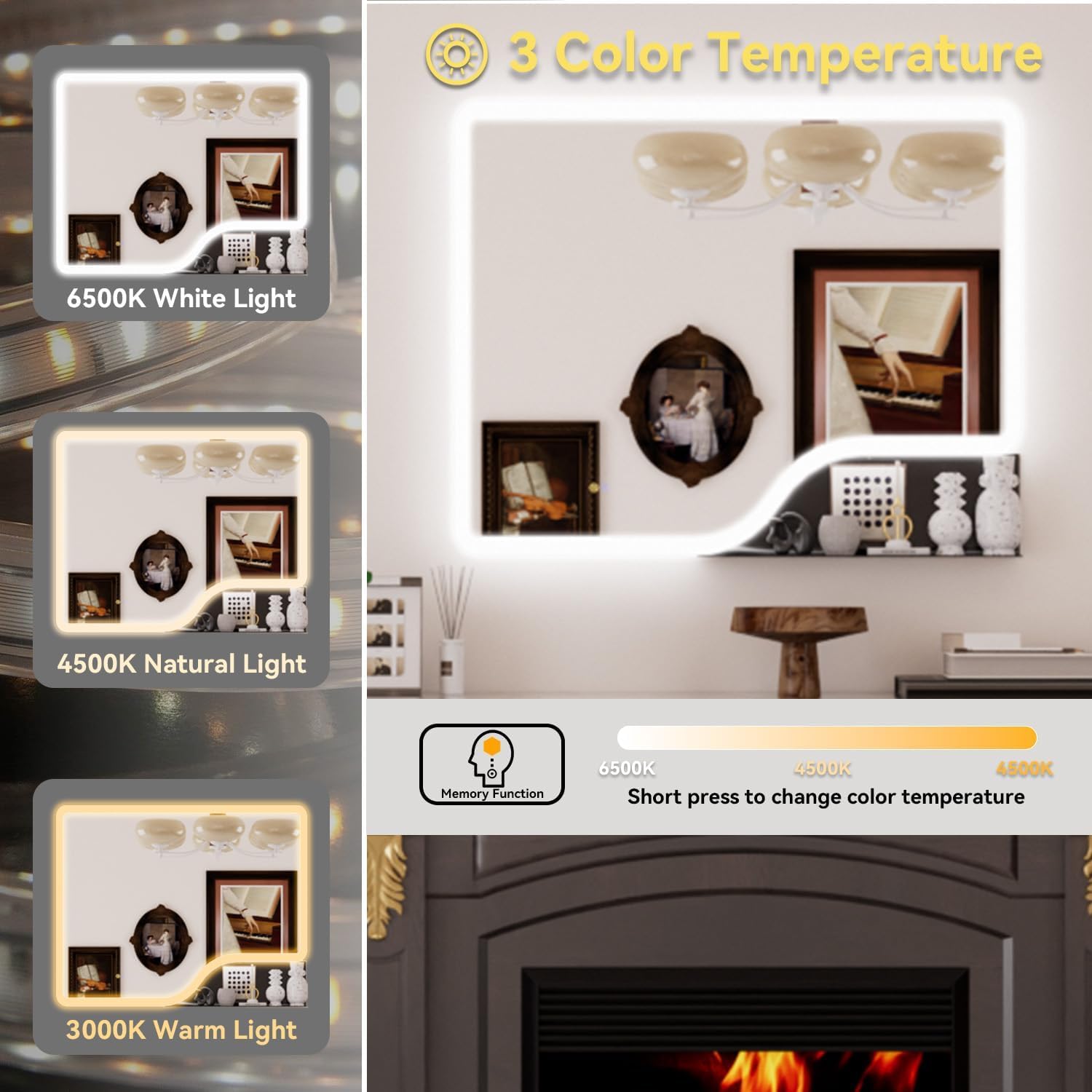 - [Smart Anti-fog Function] Say goodbye to the foggy mirror after a hot shower! This LED Bathroom Mirror upgrades a larger anti-fog area. After turning on the anti-fog function for 3 minutes, the built-in heating coil will disperse the fog evenly from the center to the edge, keeping the LED Bathroom Vanity Mirror clear. After the defog function is turned on, it will automatically turn off in 30 minutes, saving energy for you.
