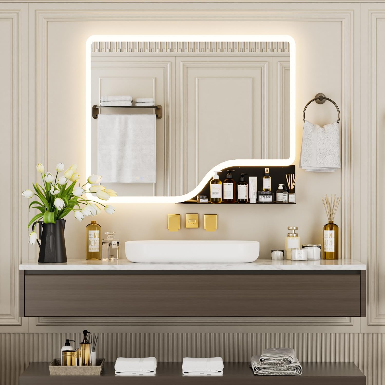- [Shelf Design] This Backlit Mirror Bathroom has a stylish and unique design, the shelf size: 27x5 inches, can provide enough space for your toiletries, cosmetics or decorations, so that your necessities are well organized. The stylish appearance design adds sophistication and elegance to your room, whether it is in the powder room, bathroom or entryway, it can easily match any decoration.