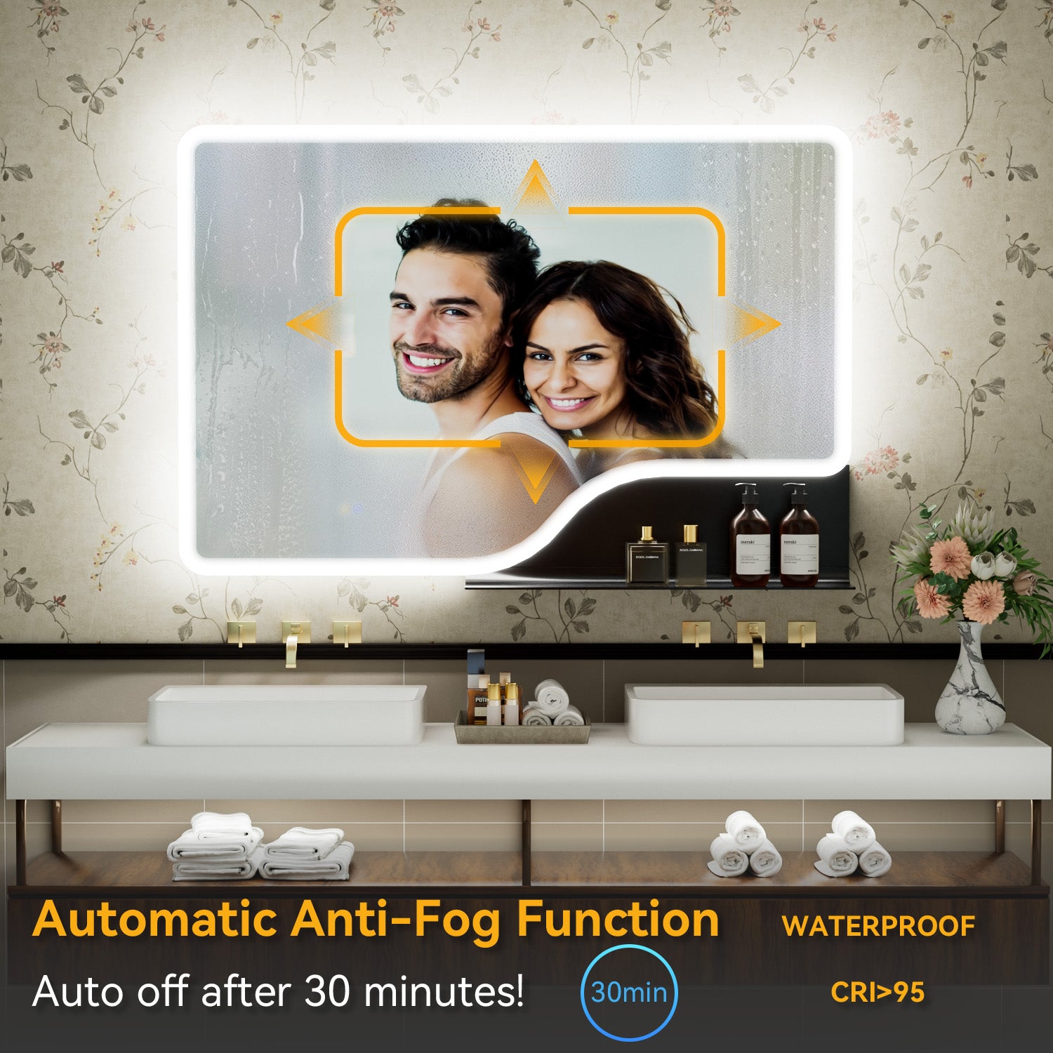 - [Smart Anti-Fog Feature for Clarity]: Say goodbye to foggy mirrors after hot showers. This vanity mirror with lights includes an advanced anti-fog function, After turning on the anti-fog feature for 3 minutes, The built-in heating coil disperses the fog evenly from the center to the edges, keeping the LED bathroom mirror clear and ready for use. Once activated, it will automatically turn off after 30 minutes, conserving energy while maintaining perfect clarity.