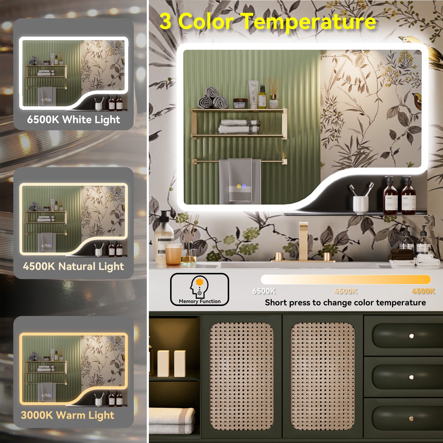 - [3 Color Temperatures & Stepless Dimming]: Short press to switch between 3 color temperatures: : Warm Light (3000K), Natural Light (4000K), and White Light (6500K). Whether you're applying makeup, shaving, or creating a relaxing atmosphere, you can easily switch between color modes to suit your preference. Long press to smoothly adjust the brightness to your preferred level. The smart memory function remembers your last settings, so the light up bathroom mirror retains your preferred lighting when you turn it on again, making it convenient for everyday use.