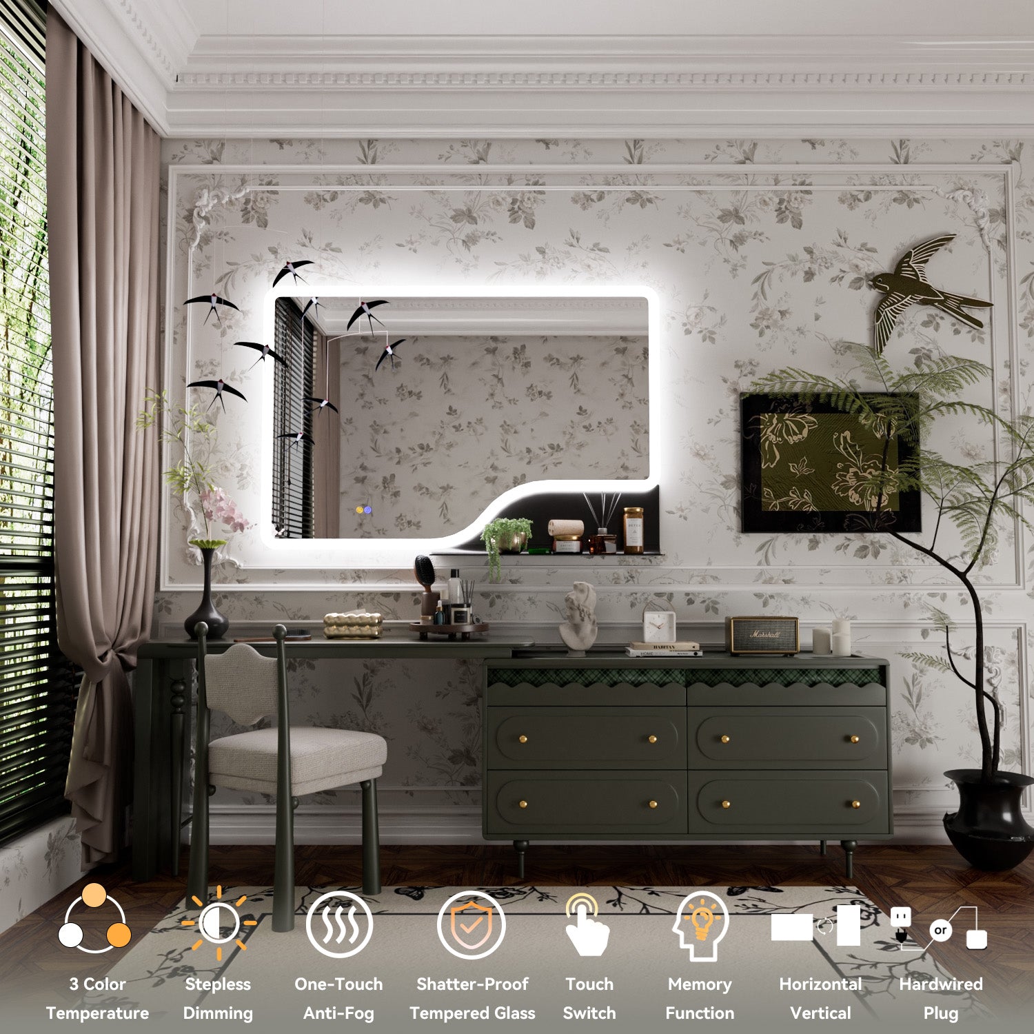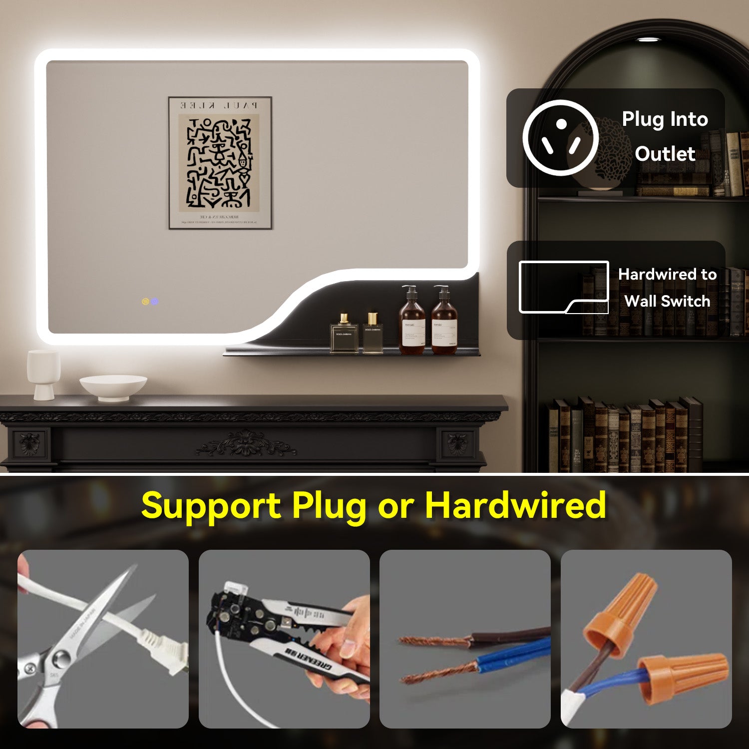 - [Stylish Backlit Design with Shelf Storage]: LED bathroom mirror features a sleek backlit design combined with a practical shelf for added storage. It not only illuminates your space but also provides a convenient place for toiletries, cosmetics, or decorative items, keeping your essentials organized. The LED vanity mirror is unique, stylish design adds sophistication and elegance to any room. Whether in the powder room, bathroom, or entryway, it effortlessly complements any decor